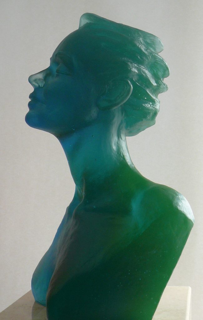 I started working with cast glass in 2005 and have since explored glass in figurative work and portrait commissions. This has led to an inquiry into the “nature” of glass, its idealizing quality as translucent and its expressive value as sculpture material in more opaque processes like pâte de verre.